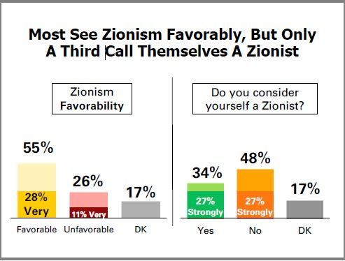 Most Jews (55%) have a favorable view of Zionism, with 26% unfavorable, and 17% not sure.